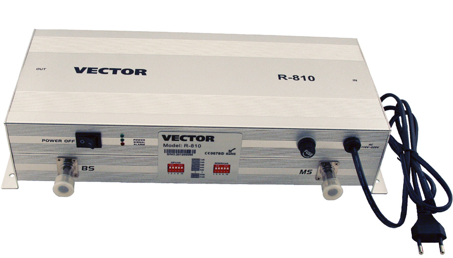 Двунаправленный ретранслятор Вектор R810 используется в точках «мертвой зоны» для стабилизации связи. Зона покрытия данного усилителя сотовой связи для телефонов составляет 1 200 м2 полезной площади. Ретранслятор стабилизирует связь в загородных коттеджах, ангарах, равнинных поверхностях большой протяженности. Использование ретранслятора не создает фоновых помех для каналов другой радиочастоты, а также не вредит здоровью рассеиванием вредных излучений.